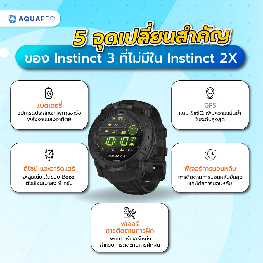 ส่วนใครที่มีนาฬิการุ่นเดิมอย่าง Instinct 2X อยู่แล้ว แต่อยากอัปเกรด บทความนี้ Aquapro เราจะพาทุกท่านมาเปรียบเทียบฟีเจอร์ และจุดเด่นต่างๆ ของนาฬิการุ่นใหม่กัน ว่าจะเหมาะกับการเปลี่ยนแล้วหรือยัง? รวมถึงรายละเอียดรุ่น สีสัน และราคา หากพร้อมแล้วมาติดตามไปพร้อมกันได้เลย !