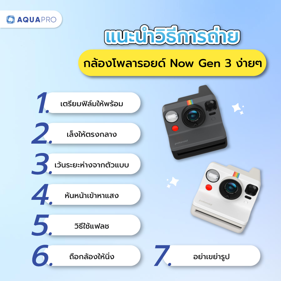 เมื่อทำการเปรียบเทียบกล้องทั้ง 2 รุ่นไปแล้ว ในหัวข้อนี้ AquaPro จะมาแนะนำวิธีการใช้งาน กล้อง Polaroid Now Gen 3 ฉบับเข้าใจง่าย มือใหม่สามารถใช้งานได้ทันที! เพียงแค่ เล็ง – กด – ได้รูป ไม่ซับซ้อนอย่างที่คิด มาดูกันว่าแต่ละ Step จะมีวิธีการยังไงบ้าง?