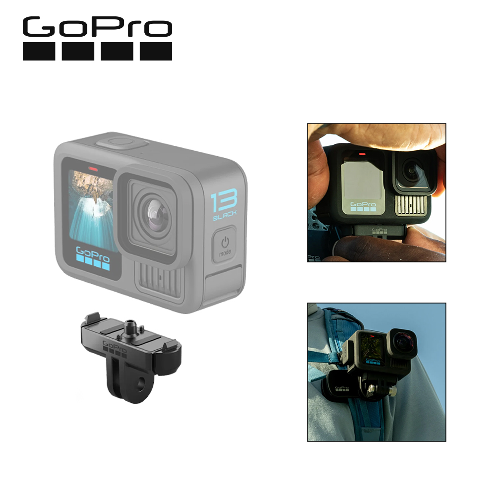 The Magnetic Latch Mount makes it easier than ever to move your HERO13 Black between mounting setups.1 Attach it to your favorite handheld grip or body mount to quickly change your POV. It uses magnets to line up your camera, so all you do is snap it in place with the auto-engaging dual latches—no thumb screw needed. Simply pinch the latches to release your camera.