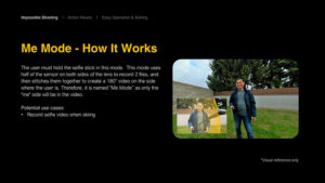 The user must hold the selfie stick in this mode. This mode uses half of the sensor on both sides of the lens to record 2 files and then stitches them together to create a 180° video on the side where the user is. Therefore, it is named “Me Mode” as only the “me” side will be in the video.