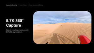 – 5.7K 360° Capture: Capture everything around you with 5.7K 360-degree capture.