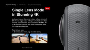 – Single Lens Mode in Stunning 4K: Just want to shoot first-person videos without reframing? Shoot wide-angle videos in Single Lens Mode and share them instantly on social media. Now upgraded to 4K30fps. At 2.7K resolution, you can also shoot an extremely wide 170° video with MaxView.