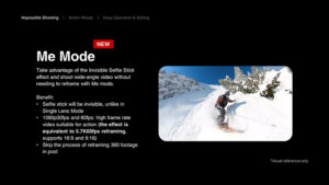 – Impossible Third-Person Views: The Invisible Selfie Stick disappears in your edit, enabling you to capture aerial angles and third-person perspectives that are impossible to achieve with other cameras. No drone, no problem!