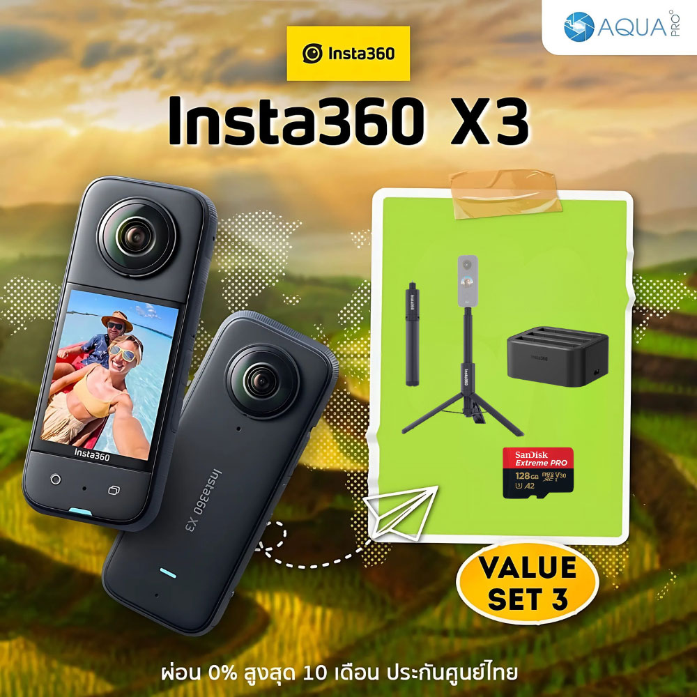พบกับโปรโมชั่นสุดคุ้มของ Insta360 X3 โปรโมชั่น ที่เรียกได้ว่าได้ทั้งกล้อง Action Camera และ มาพร้อมกับอุปกรณ์เสริมสุดคุ้มอีกมากมาย นอกจากนั้นยังมาพร้อมกับโปรโมชั่นผ่อนสินค้า และ บริการเสริมเฉพาะที่ร้าน Aquapro เท่านั้น พร้อมกับแพ็คเกจสุดคุ้มให้คุณได้เลือกตามไลฟ์สไตล์