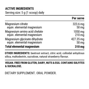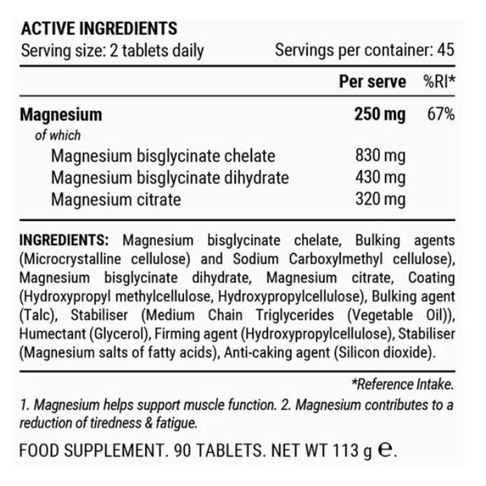 ทริปเปิ้ลแมกนีเซียมประกอบด้วยแมกนีเซียมสามรูปแบบที่ร่างกายสามารถดูดซึมได้ ซึ่งช่วยสนับสนุนการทำงานของระบบประสาทและกล้ามเนื้อและการฟื้นตัวได้หลายอย่าง นอกจากนี้ แมกนีเซียมยังใช้สนับสนุนช่วงการฟื้นตัวหลังจากออกกำลังกาย รวมถึงอาการปวดเมื่อยกล้ามเนื้อ ตะคริว และอาการกระตุก
