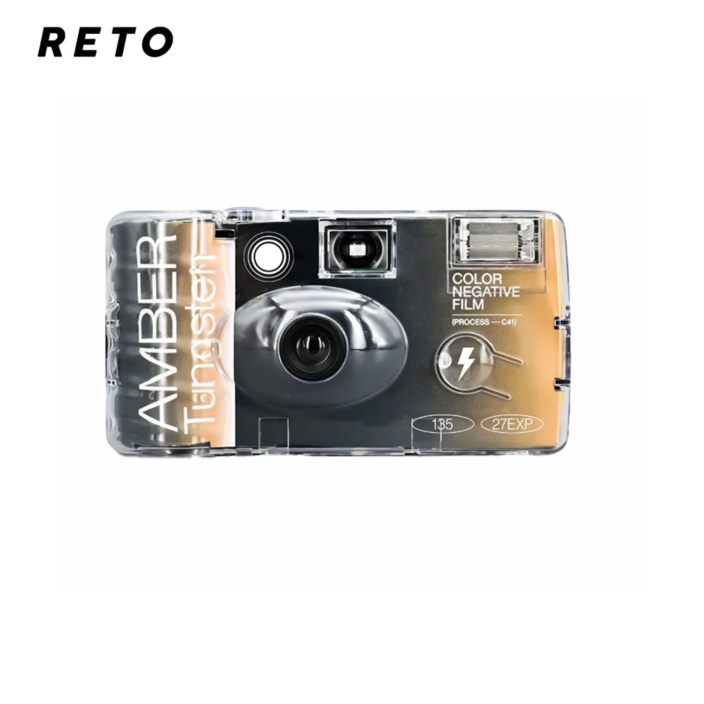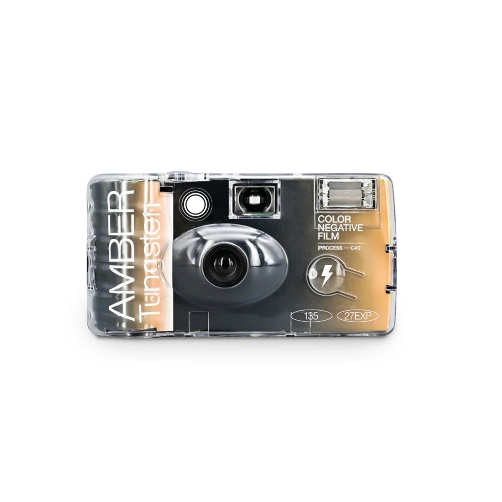 AMBER Tungsten Disposable Film Camera, 27EXP 35MM, is pre-loaded with ISO800 motion picture film. It is pocket-sized and equipped with a flash, which provides distinct colors and looks when used in different lighting conditions. It turns into a cool blue tone if filmed under daylight.