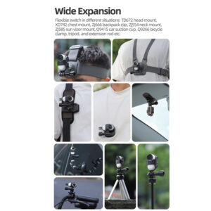 Flexible Mounting Options: Supports various mounting accessories such as head mount, chest mount, backpack clip, neck mount, sun visor mount, car suction cup, bicycle clamp, tripod, and extension rod.