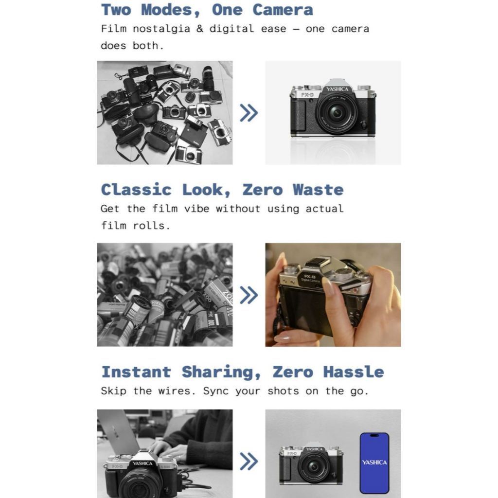 – ตัวกล้องมีโหมดจำลองฟิล์มสำเร็จรูปให้เลือกใช้ถึง 6 แบบ เช่น Yashica Sapphire 70s, Yashica 400, Ruby 60s, Golden 80s, Mono 400 และ B&W 400