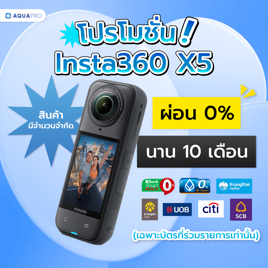 พบกับโปรโมชั่นสุดคุ้มของ Insta360 X5 โปรโมชั่น ที่เรียกได้ว่าได้ทั้งกล้อง Action Camera และ มาพร้อมกับอุปกรณ์เสริมสุดคุ้มอีกมากมาย นอกจากนั้นยังมาพร้อมกับโปรโมชั่นผ่อนสินค้า และ บริการเสริมเฉพาะที่ร้าน Aquapro เท่านั้น พร้อมกับแพ็กเกจสุดคุ้มให้คุณได้เลือกตามไลฟ์สไตล์