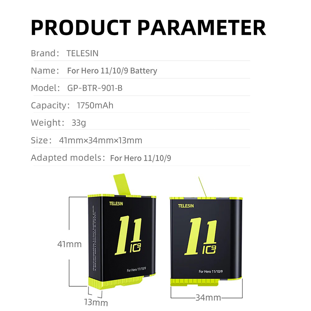 Telesin GoPro 11 / 10 / 9 Black Battery แบตเตอรี่ โกโปร 11 / 10 / 9 แบตกล้อง แบต โกโปร Battery อุปกรณ์เสริมโกโปร