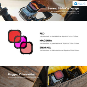 Designed for the perfect photos and videos when diving in blue, green or shallow water. Just snap the right filter onto your Protective Housing to get stunning shots in fresh or salt water. Use red for blue water, magenta for green water and snorkel for shallow water.
